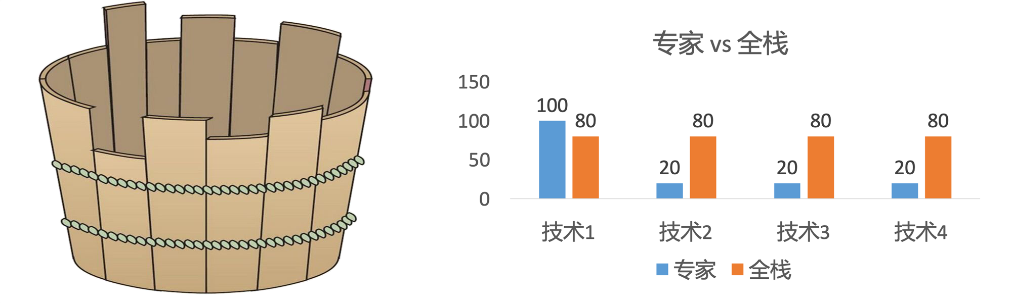 相信大家都听说过“木桶理论”,专家强调的是术业有专攻,衡量一个专家主要看专攻领域的能力;而全栈强调综合能力,主要取决于技术的短板,也就是木桶理论中最短的那块板子。