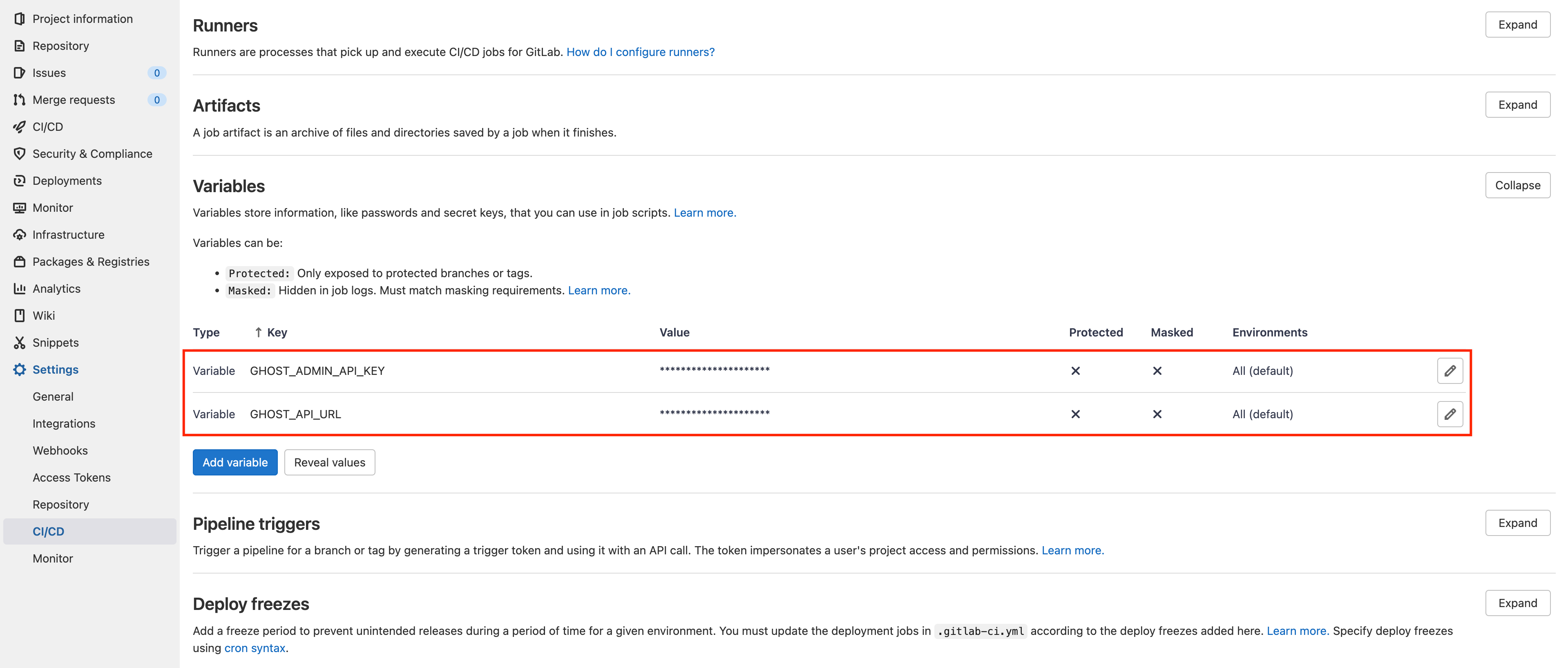下一步,去 GitLab CI 中,把这两个内容配置成变量,取名 GHOST_ADMIN_API_KEY 和 GHOST_API_URL 以便在 CI 脚本中使用。