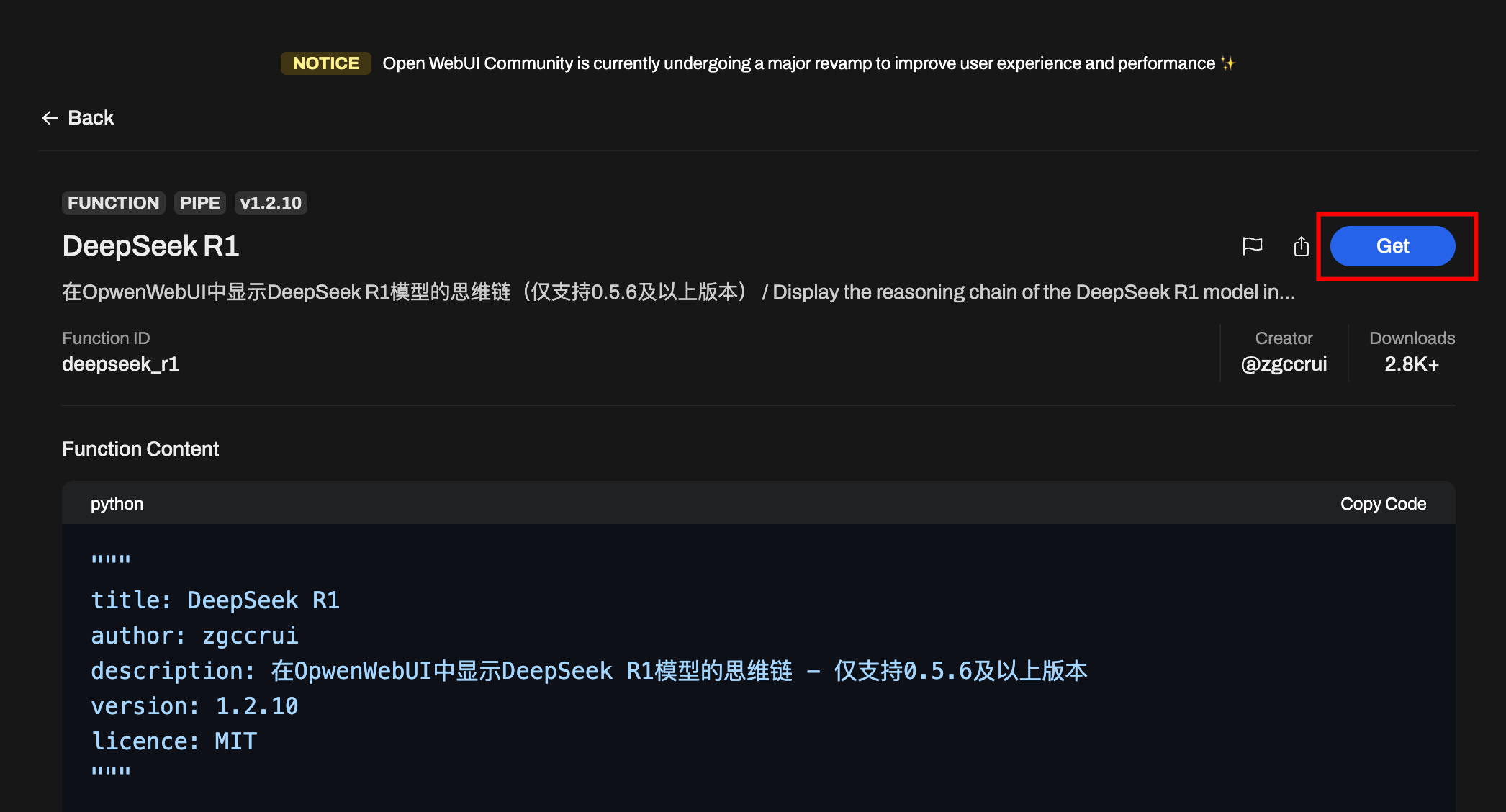 description: 在OpwenWebUI中显示DeepSeek R1模型的思维链 - 仅支持0.5.6及以上版本