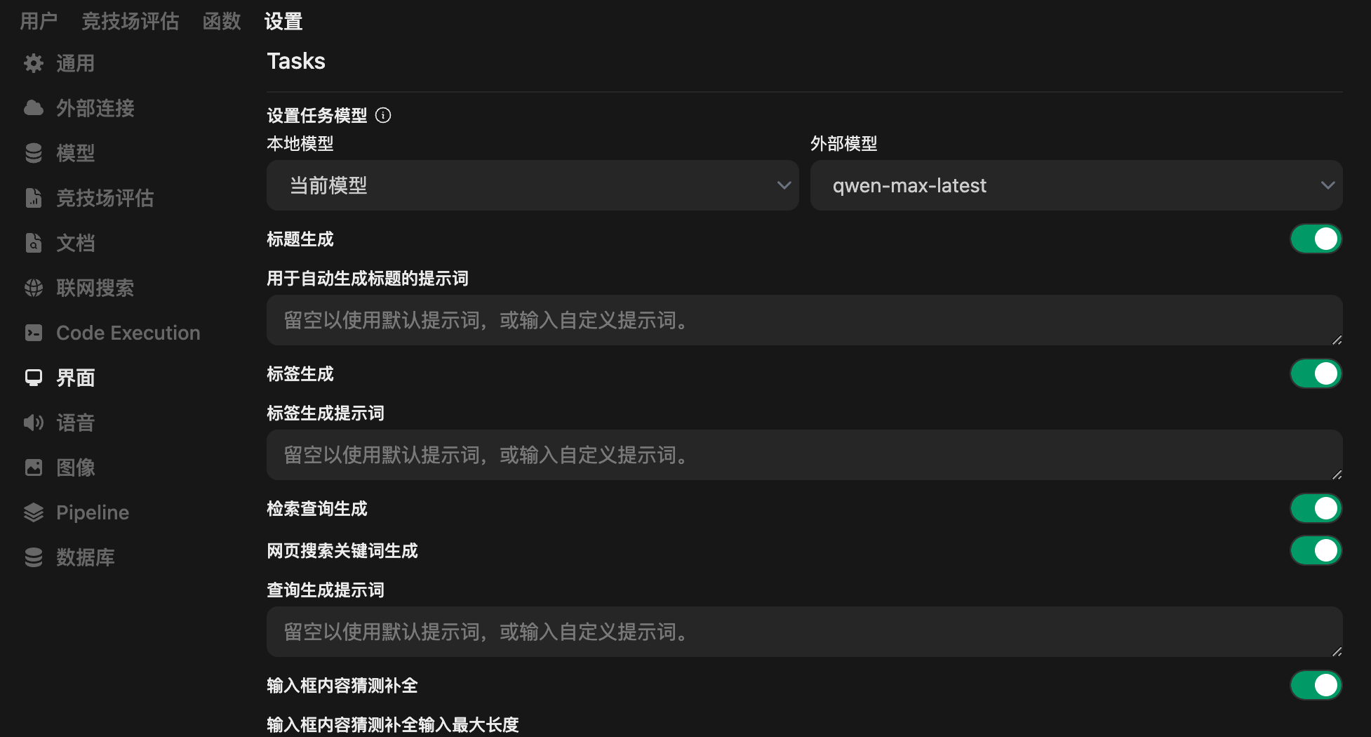 2025-02-18 更新:发现一个完美的解决方案,在 管理员设置 -> 界面 -> 外部模型 中选择一个其他模型(非配置了 Pipeline 的这个模型,例如 qwen-max-latestdeepseek-v3)即可,尽量不要用 deepseek-r1,会比较慢。